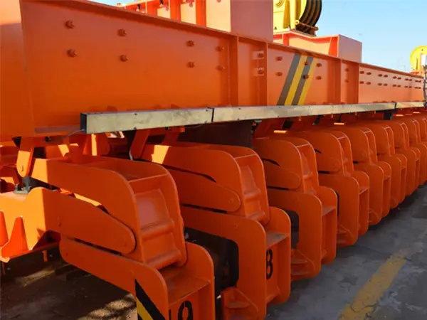 The crane is equipped with a combined clamping device capable of gripping up to 21 anode carbon blocks at a time. Through its lifting and traveling mechanisms, it accurately transports these blocks to designated locations, stacking them up to 8 layers high. Additionally, it is equipped with an electric hoist that connects to a single-block automatic clamping lug via a hook. This not only assists the combined clamp in its task of gripping carbon blocks but also allows for flexible handling of miscellaneous items. Most importantly, all carbon block clamping operations are automated, replacing the previous pneumatic clamping method, significantly reducing costs—saving approximately 400,000 RMB per vehicle.